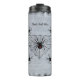 This thermal tumbler bottle to keep your drinks cold or hot has a white and black painted textured look with a black spider web shaped like a triangle with black widow spiders with red hourglass markings. Customise your text with the template.
