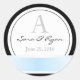 Round wedding sticker with thick black border and a blue ribbon across the bottom. Customisable text for a monogram, bride & groom's first names and wedding date. See www.zazzle.com/daisylin712 for matching wedding invitation and RSVP card.
