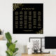 This beautiful wedding seating chart features gold text on a black background with seating assignments for up to 250 guests. It features a simple yet stylish and elegant design with ornate decorative faux foil gold filigree in the corners. The title is written in fancy script calligraphy and reads: Please find your table.