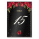 Elegant Black Background with Red Roses and Gold Accents Quinceañera Table Numbers. Easily personalise the information on these quince Table Numbers and you have your own custom made Table Numbers to match your quinceañera theme! Please view our Black with Red Roses Quinceañera Collection for complimenting and matching decor for your quince años celebration. Numerous Para Mesas negro con rosas rojas para quince años.
