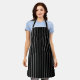 Black apron with stylish white pinstripe pattern. The thin vertical stripes are evenly spaced.