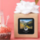 An illustration of a tribal wolf head placed on top laurel monogram. The wolf has its mussel opened in a growl. The fangs are shown from the side view. The M is short for Monogram and can be easily customisable for a personal initial. Above the angry animal is photo of an untamed wild woods that can be changed with one of your own. With so many customised options, making it a unique keepsake gift.