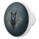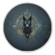 Black wolfs head with piercing blue eyes, set against a circular, ornate background. The background is a complex design of gold and iridescent patterns, resembling a magical symbol. The wolf's fur is detailed with intricate lines and shading, giving it a mystical and powerful presence.