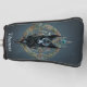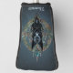 Black wolfs head with piercing blue eyes, set against a circular, ornate background. The background is a complex design of gold and iridescent patterns, resembling a magical symbol. The wolf's fur is detailed with intricate lines and shading, giving it a mystical and powerful presence.