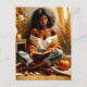 Postcard features autumn-themed artwork of a pretty black girl reading a book indoors. Fall decor such as pumpkins as well as sunflowers accent the design. A warm colour scheme gives a cosy feel to this painting of an African American (or Afro-Latina, Afro-Brit, Caribbean, African, etc.) engrossed in reading. Autumn academia aesthetic.