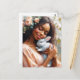 This postcard features an oil painting portrait style of a beautiful Black woman tenderly embracing a bunny rabbit. With peach flowers woven into her flowing hair and a dreamy smile on her face, the cottage-core image evokes feelings of love, peace, and springtime renewal. Perfect for Easter or anytime, this artwork radiates softness and serenity with painterly textures and pastel hues.