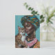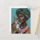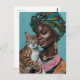 Colourful painting from a black woman wearing clothes and jewellery with African pattern. Holding her beautiful cat