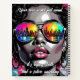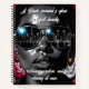 A double sided notebook with inspirational quotes about a black woman's glow that depicts an African-American woman wearing sunglasses that reflect the city's skyline. She is standing against a wall full of graffiti street art and the whole illustration is in black and white except the graffiti brick wall that is in color.
