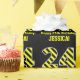 This attention-grabbing, bold, birthday-themed wrapping paper design features a large number "24", with a yellow and black striped pattern. It also features the message "Happy 24th Birthday,", and a personalised name. The background is coloured black. Fun wrapping paper like this might be used when wrapping presents being given to somebody in celebration of their 24th birthday. [~Z0000381]