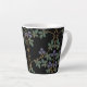 A latte mug with the wallpaper design, Blackberry by the English artist William Morris from 1917. Blue-violet flowers on thorny vines on a black background.