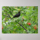 This lovely print features a photograph of a blackbird sitting in a tree. Hanging from the tree are groups of bright red berries. This photo was taken during the height of summer.