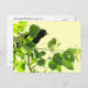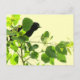 This postcard features a red-winged blackbird on a branch way up in an aspen tree. He is peeking out from behind the golden green leaves. The sky has a very pale yellow tinge.