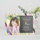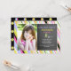 This stylish invitation has a colourful blend of diagonal stripes and see-through polka dots. It features a chalkboard panel for your personalisation next to a framed photo window and is suitable for any age.