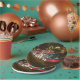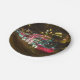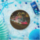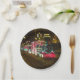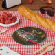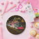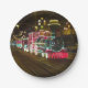 Paper plate with photo of tram decorated as a train with red, green, yellow and white lights in Blackpool as part of annual illuminations