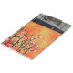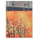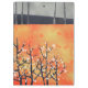 A landscape painting of Blackthorn blossom in spring on a coral orange background.