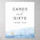 This cards and gifts sign template features a a sky blue watercolor dip and elegant golden flakes. Easily edit *most* wording to match your event.