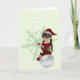 A cute little girl elf all dressed in red with jingle bells on her toes. She holds a holly spray in one hand and a Christmas ornament in the other. She is sitting on a winter orb against a snowy background. You can add text to this card.