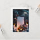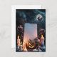 Halloween invitation card exudes a festive and spooky charm, perfect for setting the tone for a Halloween celebration. The central blank space awaits your personalised event details, flanked by glowing carved pumpkins, warm candlelight, and scattered autumn leaves. Overhead, a string of twinkling lights and fluttering bats add to the eerie yet inviting atmosphere. The dark night sky background completes the Halloween theme, making this card an ideal choice for inviting guests to a memorable Halloween party.