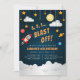 Cool space themed birthday party invitations feature a rocket ship, stars, planets and clouds against a night sky background, with "3, 2, 1...blast off" in bright comic book style lettering. Personalize with your birthday party details beneath.