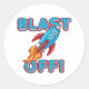 Our Blast Off design is a great design for kids of all ages who love space and rocket ships, features a blue and red rocket ship with flaming exhaust and text that reads Blast Off! Blast Off rocket ship T-shirts, bibs, blankets, cards, stickers, mugs, bags, pillows, wall clocks, and much more!