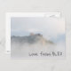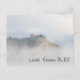 Postcard of historic Bled castle, built upon the rocks along Lake Bled, surrounded by clouds and ground fog, like it is a castle built in the sky, in Bled, Slovenia with the text 'Love from BLED'.