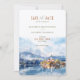 Set the stage for a magical wedding with this "Save the Date" card, featuring a beautiful watercolor illustration of Lake Bled in Slovenia. The design captures the serene beauty of Bled Island with its iconic church, surrounded by reflective lake waters and snow-capped mountains in the background. The card’s colour palette blends soft blue and white tones with hints of warm autumnal shades, creating a romantic and tranquil atmosphere. Elegant typography in a mix of modern and script fonts adds sophistication to this charming invitation, perfect for couples planning a picturesque destination wedding.