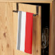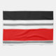 This towel will look great in a kitchen with a black, red, white, and silver decor.