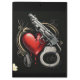 This vintage black-and-white illustration showcases a handcuff and handgun alongside a bleeding red heart, set against a dark background with soft light accents. The gold touches add elegance, capturing the intense themes of love and conflict.