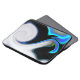 Stamped soft grey and black with smooth texture and curves that look like a thick blue neon border with part that looks like 3D-like depth and relief.