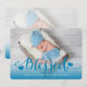 Announce the arrival of your new little baby boy with this sweet birth announcement. The word "Blessed" in blue script with two hearts and a blue ombre background design with your baby photo is a perfect design to showcase your son. Add your baby name and birth information on the back with your family names and text. Elke Clarke © Other colours available in our shop at www.zazzle.com/epclarke