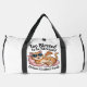 This white duffle bag features a cute cartoon cat wearing sunglasses and lounging on a pillow, holding a slice of pizza, with the text "Too Blessed to be Stressed" and "Unless it's about Food!" below. This humourous and relatable design is perfect for cat lovers who also enjoy their snacks. Edit colour of the bag caps and body in the Design tool to your favored colours.