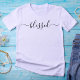 A romantic script black lettering on a white t-shirt that says: blessed. For Christians. Godly women. Pretty. Keep the little boxes flanking the word to have the decorative flowing letters motif.