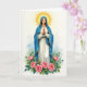 This design shows a serene woman centered on the card, standing quietly with her eyes lowered as if lost in a gentle, caring thought. She wears a glowing white gown draped with a deep blue mantle, both edged with thin gold trim that falls in soft folds around her. Her hands are clasped at chest level, and the calm pose suggests a tender, comforting presence, like a friend staying close in a quiet moment 🌷. Above her head, a golden sunburst halo spreads outward in warm rays that softly light her face and clothing. Along the bottom, a thick cluster of pink roses with green leaves and curling stems forms a natural base, adding a romantic touch through their full petals and close-packed arrangement 🐇. The background is washed in pale blues and greens that resemble distant clouds or soft foliage, keeping the focus on the figure and flowers. Any greeting text would sit near the top in small gold lettering, leaving the roses and blue mantle to frame the lower half of the scene. The roses show layered petals and fine stems against the smooth finish of her gown and the radiating gold halo.
