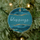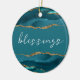 Elegant ceramic ornament featuring the word "blessings" in a pretty agate geode slice with deep teal and turquoise watercolor texturing background and gold glitter accents. Inspirational and motivational hanging decor. Personalise with your own words or message.