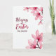 This greeting card features a white background with two clusters of pink blossoms that frame the message like a gentle embrace 🌷. One floral arrangement sits in the upper right, and the other balances it in the lower left, creating a quiet, friendly symmetry. The petals fade from a pale blush at the edges into deeper rosy tones toward the centers, where the color gathers like a tender blush. Fine, dark stamens stretch outward with tiny dotted tips, adding small details that feel careful and affectionate. Centered on the page, the main line of text reads “Blessings at Easter” in a flowing, decorative letter style in deep maroon, drawing the eye first. Just below it, “DEAR DAUGHTER” appears in uppercase serif lettering in the same maroon shade, set smaller and neatly aligned under the main phrase 🐰. The upper-right blossoms angle slightly inward toward the words, and the lower-left flowers mirror that tilt with matching pink gradients and dark dotted stamens.
