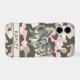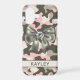 Customize this blingy pink, green and cream camouflage iPhone 17 case with an olive green satin bow with a diamond center and your name in a trendy modern CAP font in dark green on cream. It's so girly, blingy and chic! Perfect for any country girl!