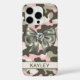 Customize this blingy pink, green and cream camouflage iPhone 16 pro case with an olive green satin bow with a diamond center and your name in a trendy modern CAP font in dark green on cream. It's so girly, blingy and chic! Perfect for any country girl!