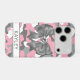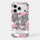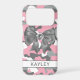 Customise this pink, grey and white camouflage iPhone 17 pro case with a grey satin bow with a diamond centre and your name in a trendy modern CAP font in dark grey on white. It's so blingy, girly and chic! Perfect for any country girl!