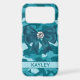 Customize this blingy teal camouflage iPhone 17 pro max case with a dark teal satin bow with a diamond center and your name in a trendy modern CAP font in dark teal on light teal. It's so modern, girly and trendy! Perfect for any country girl!