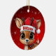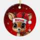Blitzen! Celebrate the holiday season with this festive round ceramic red ornament featuring an endearing woodland forest animal cartoon graphic of a cute baby reindeer wearing a Santa hat. Perfect deer with antlers for decorating your tree or as a thoughtful gift, this whimsical doe decor makes a cherished keepsake for years to come. Customize by changing the text, the font, the font color, or remove the text. You can even transfer this design onto other products. Enjoy this design your way! Check out ForestBabies Xmas Deer Collection for matching decorations. 🎄🦌