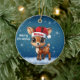 Blitzen! Cute animal reindeer character, baby deer with antlers and personalizable Santa hat with festive blue snowy backdrop. Unique winter wildlife graphic with a light snow. Round ceramic ornament, with customizable Merry Christmas written in white. for decorating your holiday tree or as a thoughtful gift, this whimsical woodland doe decor makes a cherished keepsake for years to come. Customize by changing the text, the font, the font color, or remove the text. You can even transfer this cartoon fawn illustration onto other products. Enjoy this design your way! 🎄🦌