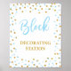 BLOCK DECORATING STATION baby shower sign featuring a beautiful blue and gold glitter confetti design.