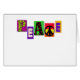 Bright multicolored block letters that spell out "PEACE" on peace T-shirts, buttons, mugs, mousepads, magnets, and other items that promote world peace!
