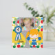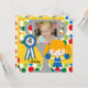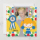 A blonde haired little cheerleader, championship trophy with an area you can add your little cheerleader's photo, a blue ribbon, lots of colourful polka dots, and areas you can easily customise with your birthday party specifics on a cheerleading theme birthday invitation she's sure to love!
