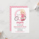 This girl's birthday invitation features a cute blonde haired girl with her pink bicycle. On pink and white cute scallop accent background with dots and girl on back.