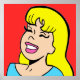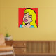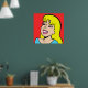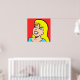 This Blonde Bombshell Comic Strip Poster features a comic style drawing of a beautiful, blonde girl on a red background. She has a button nose, full pink lips and the brightest of smiles. Her eyes are closed, probably due to the weight of her lush, black lashes. She has a thick fringe of bangs and flowing yellow hair that extends past her shoulders. Her aqua shirt is barely visible at the bottom of the design. She looks as if she doesn't have a care in the world. And, really, she shouldn't have a care in the world. After all, she is a cartoon.
