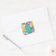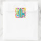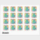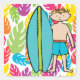 A blonde haired boy with a blue surfboard against a background of multicolors tropical leaves on stickers that match our Blonde Boy Surfer invitations and postage stamps.