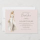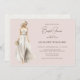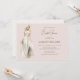 Bridal shower features an illustrated blonde bride in wedding gown on a blush pink background. Delicate lace illustration on back of invitation.