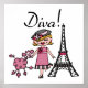 Diva T-shirts, bodysuits, mugs, bags, cards, stickers, key chains, pillows, wall clocks, and much more with a cute diva design featuring a blonde haired girl in a hat and pink dress with her pink poodle near the Eiffel Tower!