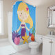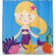 Pretty and cute shower curtain for girls who love the ocean and mermaids, features a cute blonde haired mermaid, coral, seaweed, seashells, and a starfish on a bright blue background.